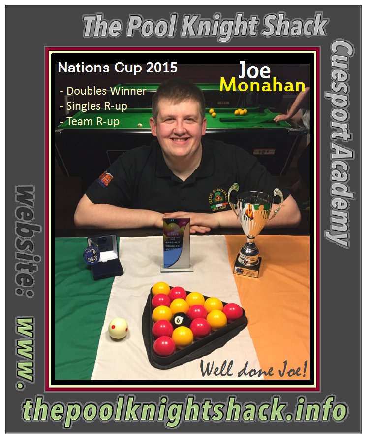 Joe put in a serious amount of practice for the Nations Cup. He religiously visits The Pool Knight Shack Cuesport Academy several times each week and his game has improved tremendously. As a result, his acomplishments are very much deserved. Keep up the good work Joe, there are many more winners medals within your reach.